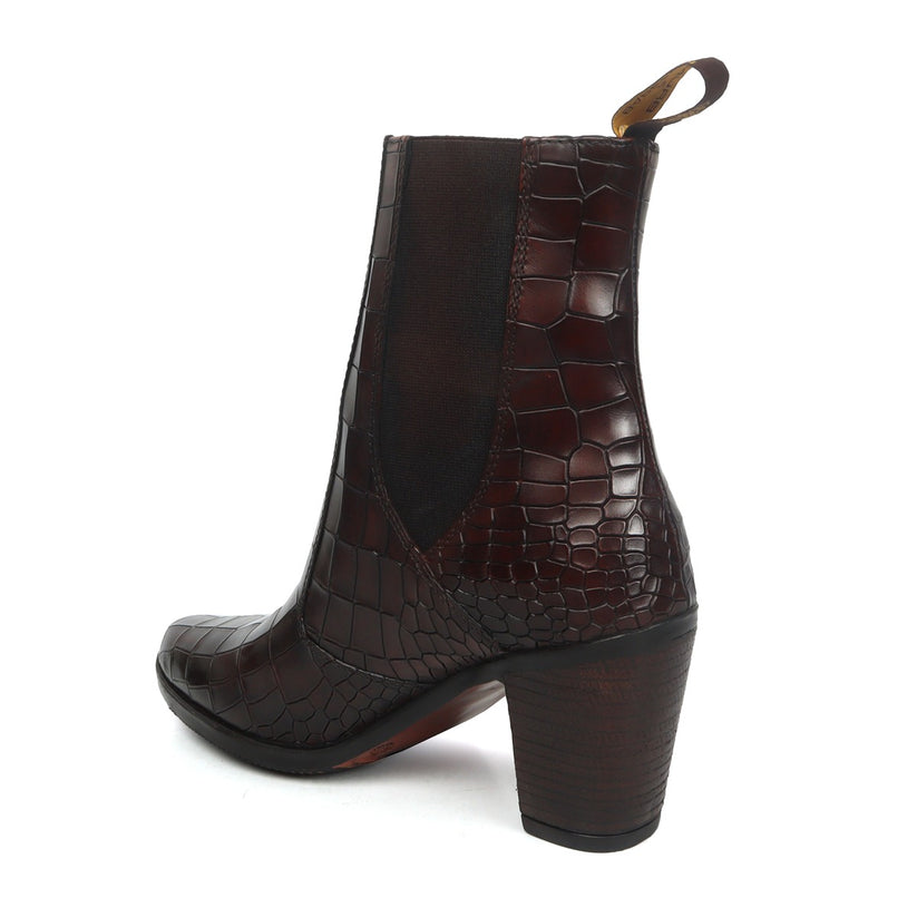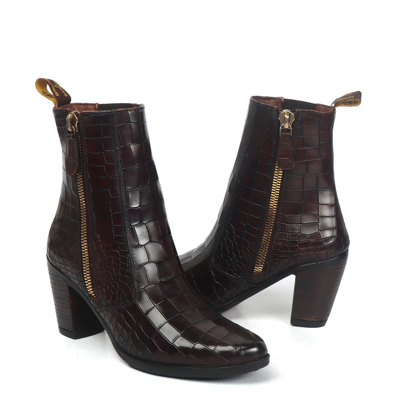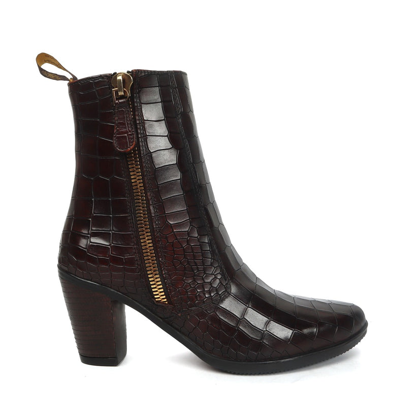 An elegant design for the fashion forward ladies out there. It is hand colored in deep darker tone of Brown on imported Deep Cut Croco Leather. Outer side zip and inner side elastic provides the extra convenience to wear it. The high ankle length ensures to look good from casuals to formal attires. It is a perfect footwear to gift to that perfect woman in your life. The color can also be customized further with your matching apparels.